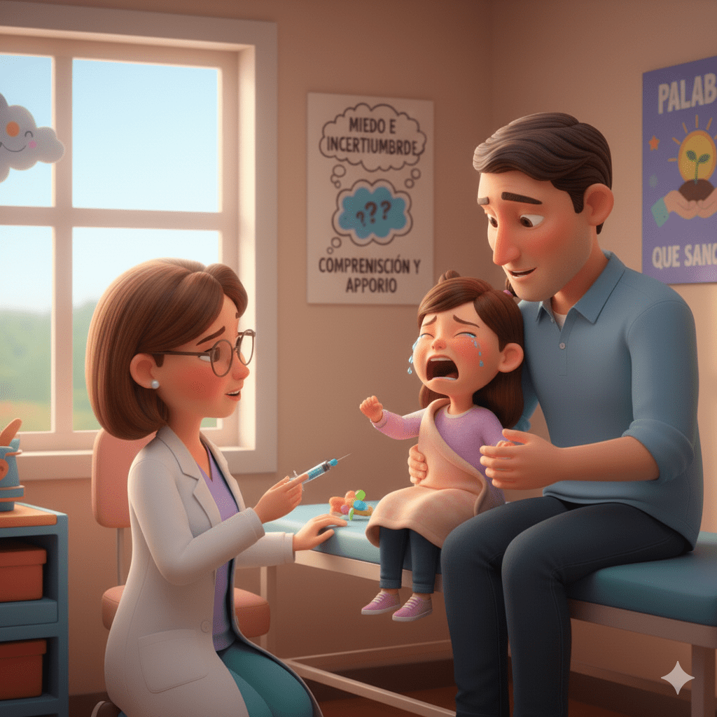 Esta entrada nace de la necesidad de abordar una realidad que vemos todos los días en nuestra practica clínica: niños aterrorizados por «ir al médico» y amenazados además que se les picara si no dejan de llorar, padres angustiados que no saben cómo explicar a sus hijos lo que está pasando, y profesionales de la salud que, a pesar de sus mejores intenciones, a veces perpetúan dinámicas de miedo y desconfianza por falta de herramientas comunicativas adecuadas. Es crucial entender que para un niño, estar en un hospital o clínica no es solo un inconveniente temporal, sino una experiencia que puede moldear su relación con la medicina y los profesionales de la salud durante toda su vida. Cada interacción que tenemos con ellos es una oportunidad de construir confianza o, lamentablemente, de sembrar miedos que pueden durar décadas.